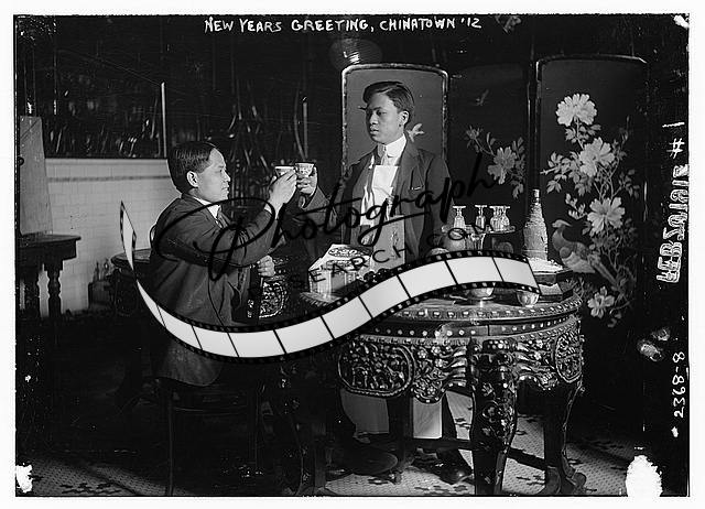 New Years Greeting,Chinatown 1912,men drinking tea?,table