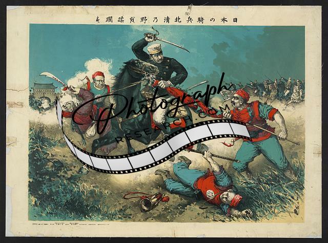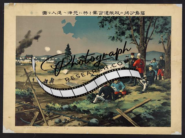 Summary: Print shows the Japanese commander, Colonel Awaya, standing with sword raised, leading his troops in the attack against a walled city, possibly Tianjin, China; British forces attack from the left and French forces approach from the right.