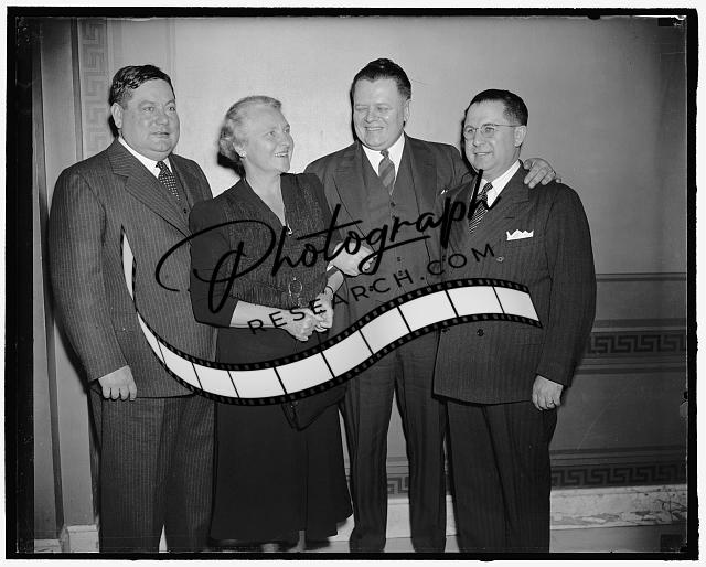 Title: Wage and Hour Administrator takes oath. Washington, D.C., March 4. Col. Philip Flemming, here-to-fore loaned out by the army by executive order to administer the Wage & Hour law, today was sworn in as administrator. The ceremony took place in the presence of the Secretary of Labor, Frances Perkins, while Chief Clerk Samuel Gompers administered the oath. Left to right: Col. Flemming, Miss Perkins, Mr. Gompers, 3-4-40
