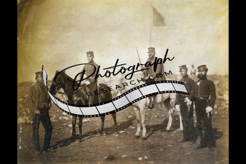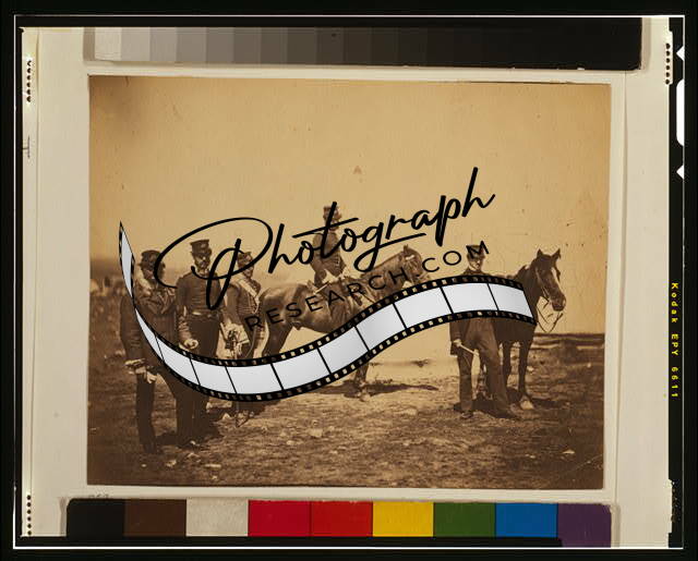 Summary: Colonel Adye and Captain Whitmore, one man mounted, the other standing by horse, full-length portrait, facing front.