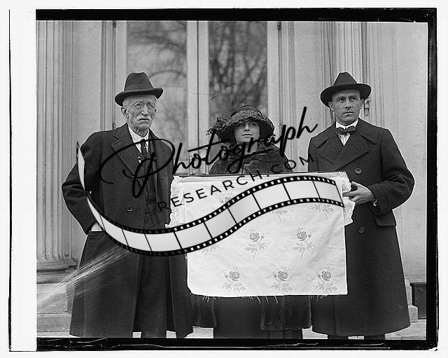 Two men,woman holding fabric with rose pattern,2/15/23,February 1923