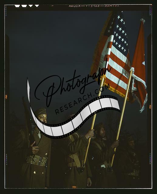 Color guard,African American engineers,flags,night,Fort Belvoir,Virginia,VA,1941