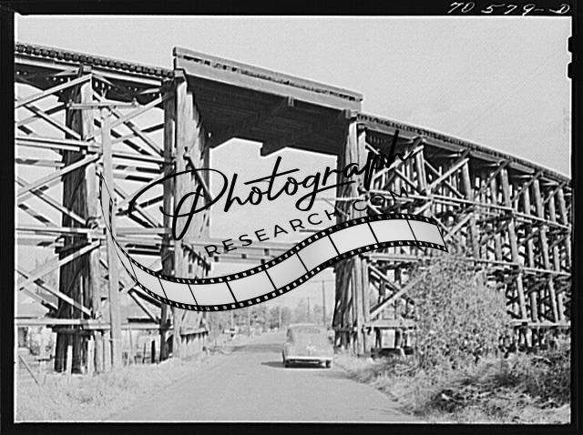 Highway goes under wooden trestle for railroad,Cowlitz County,Washington,WA,FSA