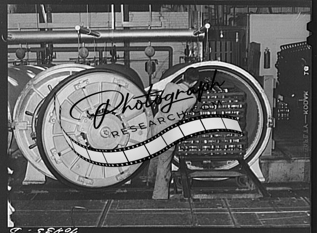Title: Putting cans of salmon in trays before placing in ovens, where they will be cooked one and a half hours. Columbia River Packing Association, Astoria, Oregon