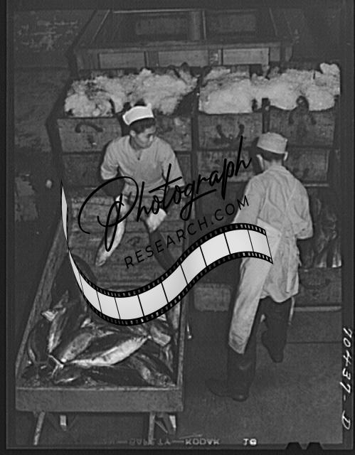Title: Putting trays of canned salmon into ovens for cooking. Columbia River Packing Association, Astoria, Oregon
