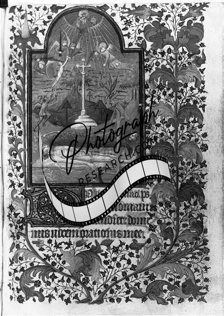 Miniature, leaf (4) recto - showing God, angels and graveyard above corpse on pall, in Horae (Paris use). Written ca. 1425