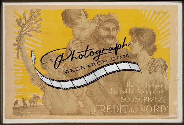Summary: In the foreground is a family without a husband. In immediate background, there is a large American flag. At the left is a wounded soldier, and on the right, is a peasant ploughing in the field. Approximately eight million acres of French land were devastated by the war.