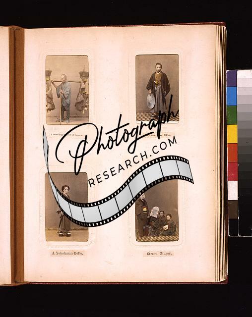 Captions on front of item: 'The Commandant of Yokohama Garrison' (upper left); 'One of the Gorogio' (upper right); 'Three friends meeting' (lower left); and 'Japanese wrestlers in everyday garb' (lower right).