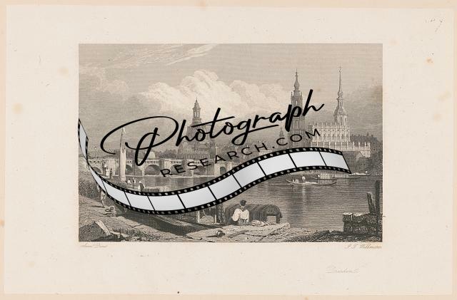 Dresden, Print shows a view from the right bank of the Elbe River showing the "Augustus Bridge", "Dresden Cathedral", and the "Frauenkirche".