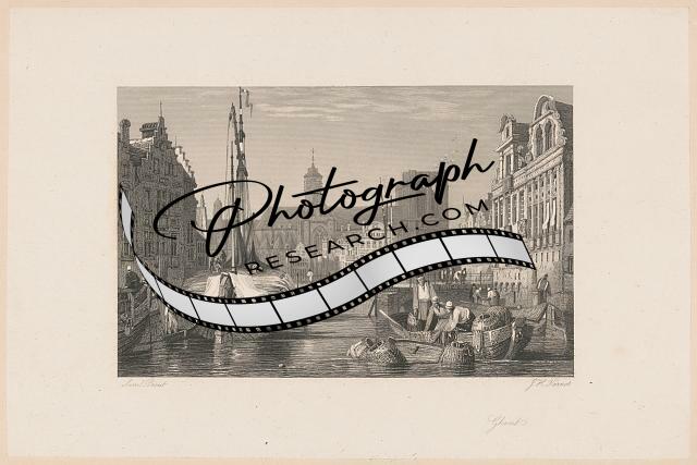 Ghent, Print shows a view of the waterfront area along the canal with boats, fishermen, and others, with municipal buildings to the sides and St. Michael's Church in the background.