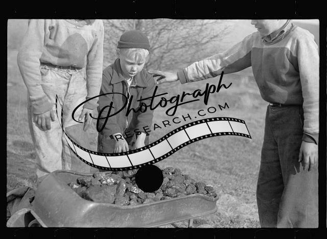 Title: Miner's sons salvaging coal from slag pile during May 1939 coal strike. Kempton, West Virginia