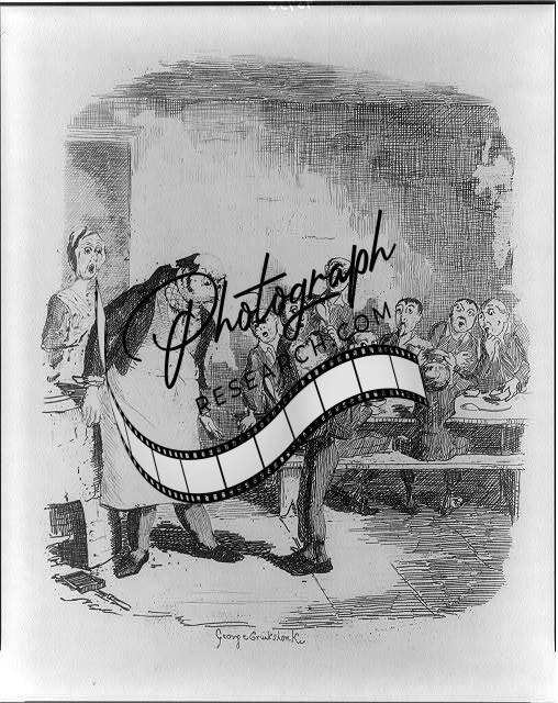 Oliver Twist asking for more,Etching by George Cruikshank,man,woman,boys eating
