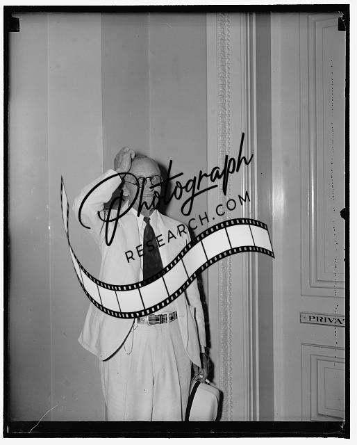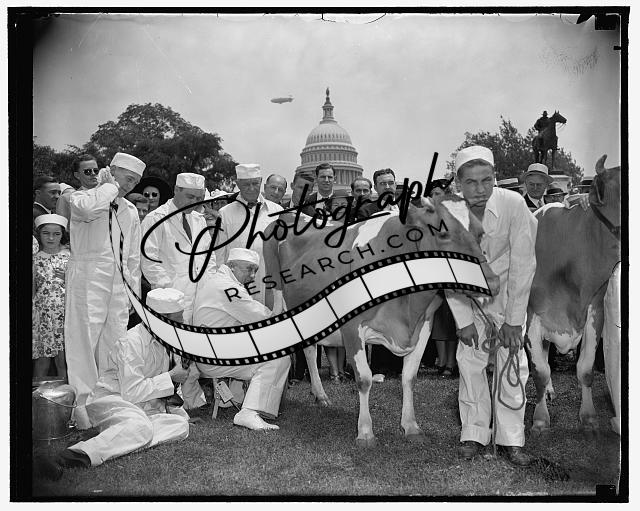 Title: Congressional cow milker fold in the stretch. Washington, D.C., June 9. Rep. Harold Knutson, Republican of Minnesota, competing for the milking championship of the 75th Congress with three other representatives today on the Capitol plaza; started off with the grace of an electric milker. However, he folded with the rest of the solons after 10 minutes of effort produced no more than a pint. Rep. Marvin Jones, referee, declared the contest a draw, 6/9/38