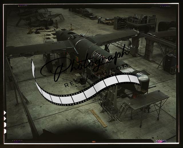 Title: Lowering an engine in place in assembling a transport plane in a Consolidated Aircraft Corporation plant, Fort Worth, Texas