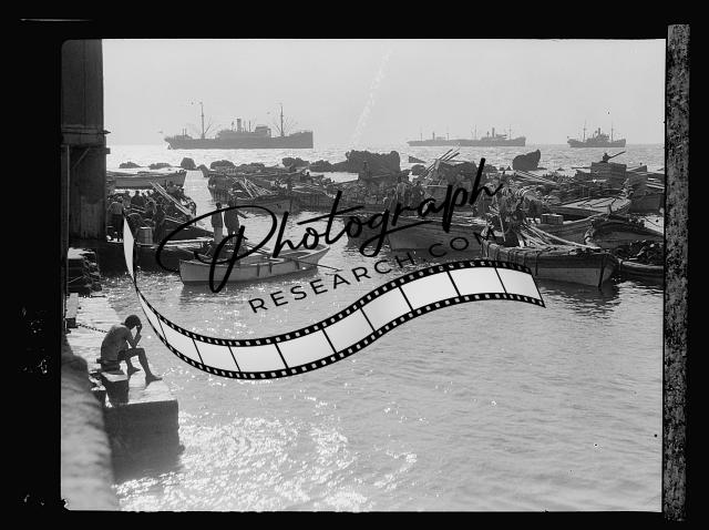 Title: Construction of Jaffa pier. Construction work on Jaffa sea front. General view showing site of house of Simon the Tanner in upper right hand corner
