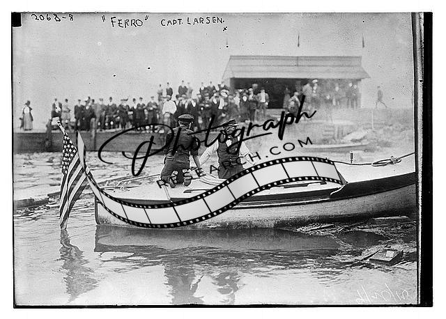 'Ferro' Captain Larsen,American flag,boat,people on dock,Bain News Service
