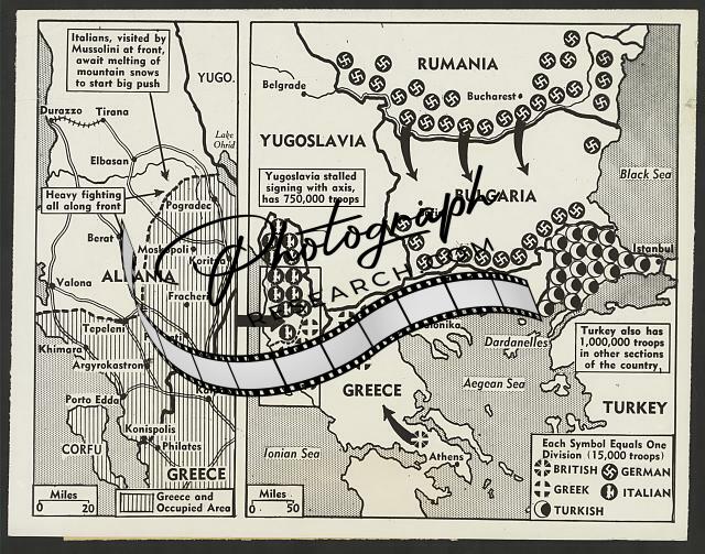 All Balkans an armed camp as war flares in Albania, Nazi, Photograph shows a map of troops lining the Balkan borders and a map of the Albanian theatre.