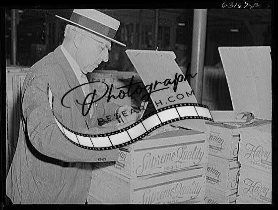 Title: Commission merchant examining produce at fruit terminal warehouse before auction begins. Chicago, Illinois