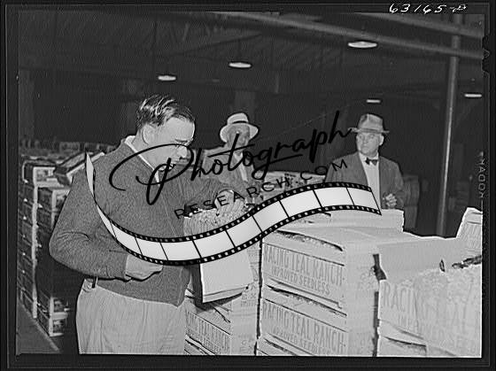 Title: Commission merchant examining produce at terminal warehouse before auction begins. Chicago, Illinois
