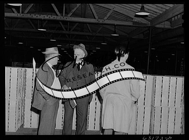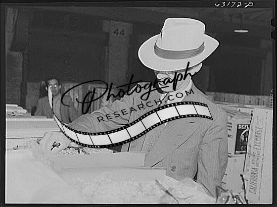 Title: Commission merchants examine and make notes on shipments of fruit for which they intend to bid. Terminal warehouse, Chicago, Illinois