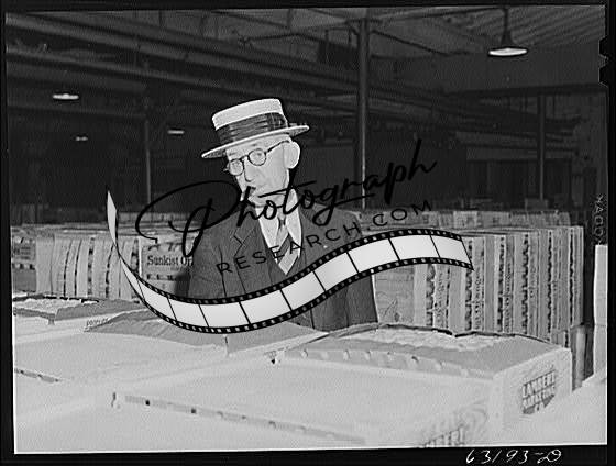 Title: Commission merchant examining fruit at terminal warehouse. Chicago, Illinois