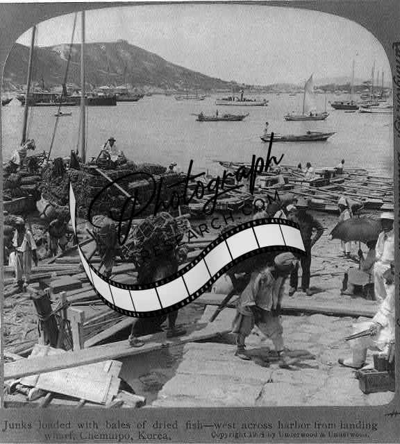 Junks loaded,bales of dried fish,harbor,landing wharf,Chemulpo,Korea,c1904,2