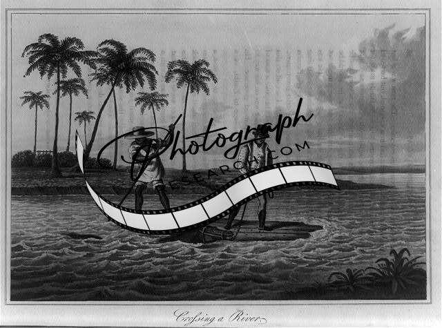 Crossing,river,rafts,water transportation,pole,punting,rope,horse,Brazil,1816