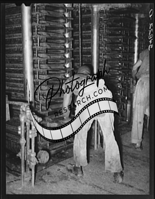 Title: Removing cotton cake from hydraulic presses after oil has been removed. Cotton seed oil mill. McLennan County, Texas