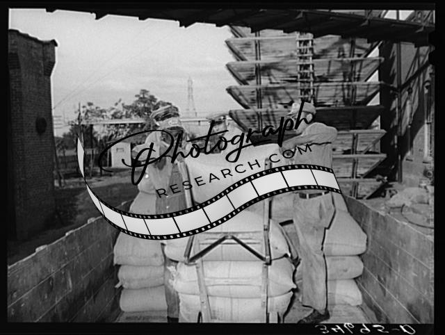 Title: Negro worker pounding down sack so that stored sacks of feed will pack more evenly. Cottonseed oil mill. McLennan County, Texas