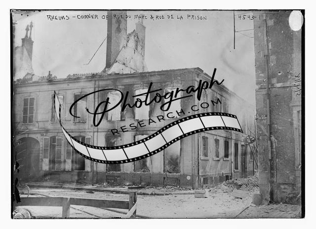 Rheims,France,Rue Du Marc & Rue De La Prison (corner),damaged building,rubble