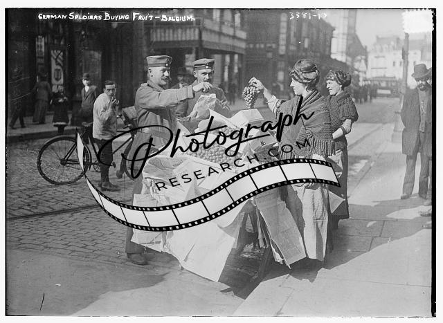 German soldiers buying fruit -- Belgium,women,grapes,military,bicycle,Bain News