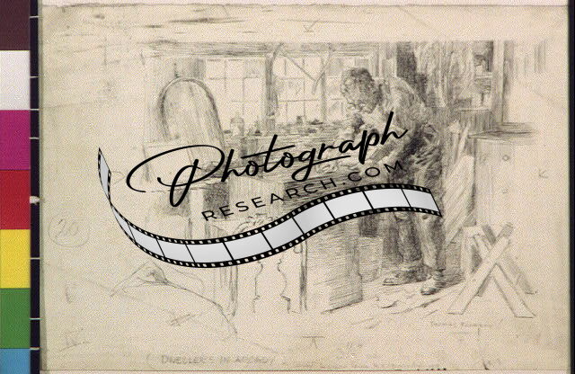 Man cleaning chest of drawers in cluttered room,Thomas Fogarty,1919?,Furniture