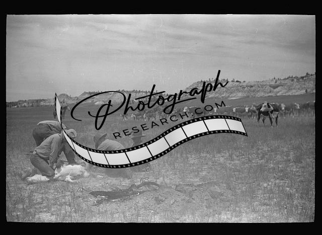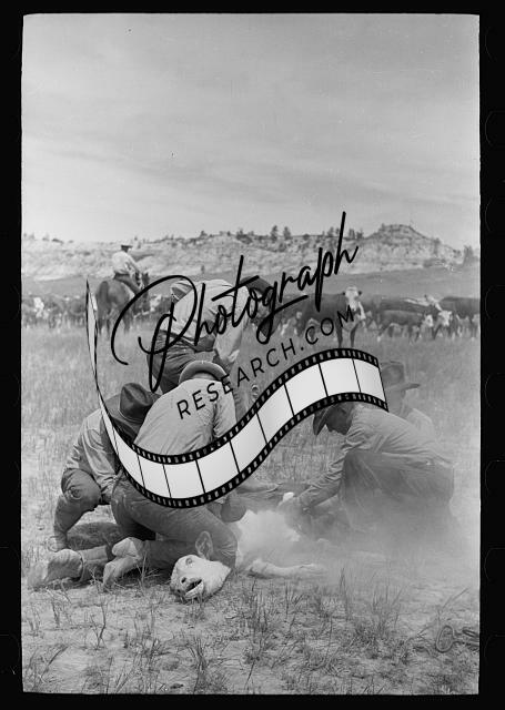Branding a calf,Quarter Circle U roundup,Montana,MT,June 1939,Rothstein,FSA