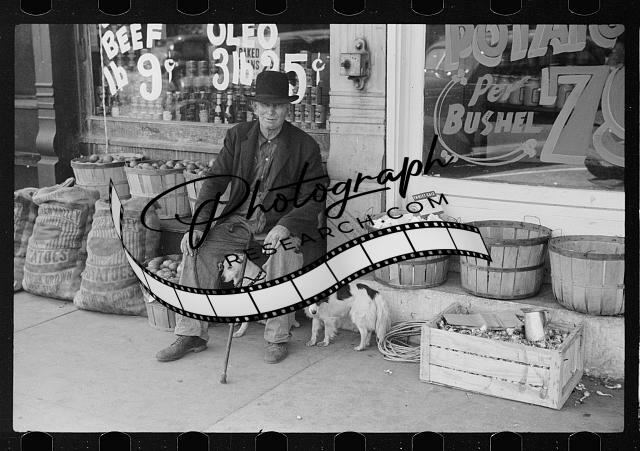 Man,dogs in front of grocery store,Robinson,Illinois,May 1940,IL,John Vachon,1