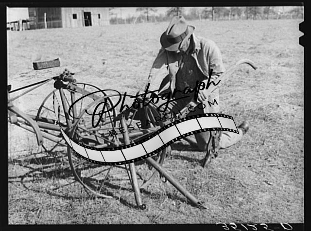 Title: Pomp Hall, Negro tenant farmer, repairing piece of tin which covers window of his house. Creek County, Oklahoma. See general caption number 23
