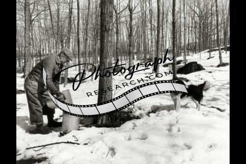 Young Sugar Maple Tree Tapped,Georgia,Vermont,VT,snow,winter,sap,bucket,dog