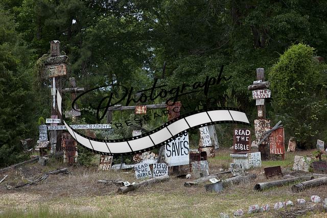 Title: Rough wooden crosses and peeling hand-lettered signs bearing Bible scripture fragments are nailed to fences, trees, and each other in the late W.C. Rice's stark Cross Garden, Prattville, Alabama