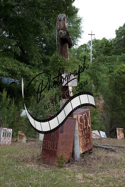 Title: Rough wooden crosses and peeling hand-lettered signs bearing Bible scripture fragments are nailed to fences, trees, and each other in the late W.C. Rice's stark Cross Garden, Prattville, Alabama