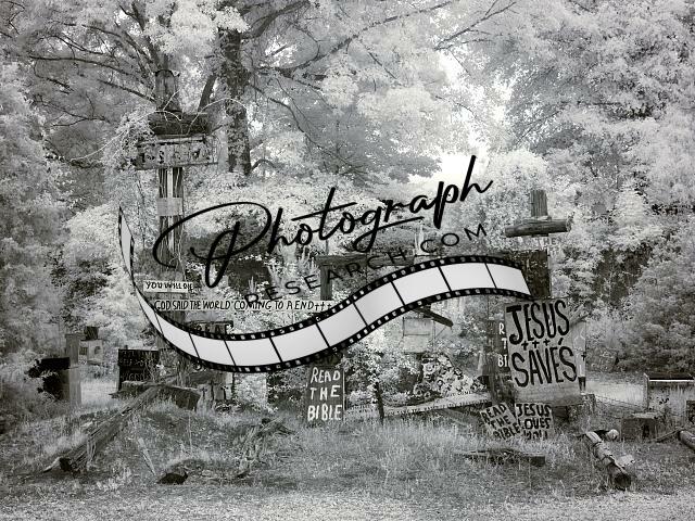 Title: Rough wooden crosses and peeling hand-lettered signs bearing Bible scripture fragments are nailed to fences, trees, and each other in the late W.C. Rice's stark Cross Garden, Prattville, Alabama