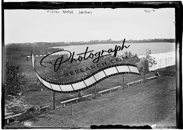 View of pistol range,Sea Girt,wooden benches,water,trees,September 1908