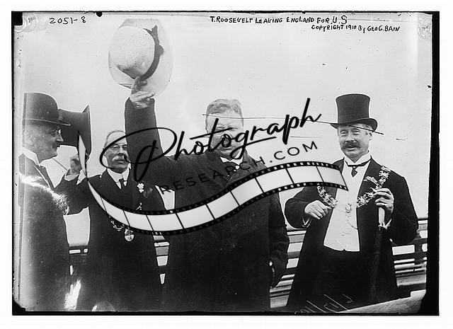 Theodore Roosevelt leaving England for United States,1910,hat held in air,men