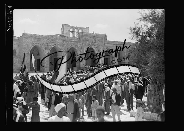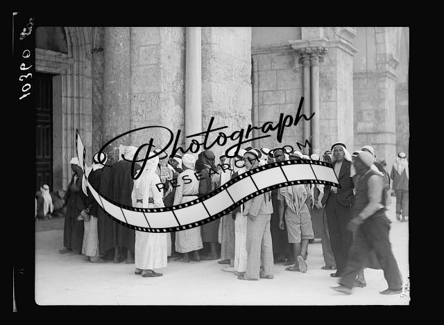 Groups of Arabs in the Mosque al-Aqsa grounds reading rebel posters,Jerusalem