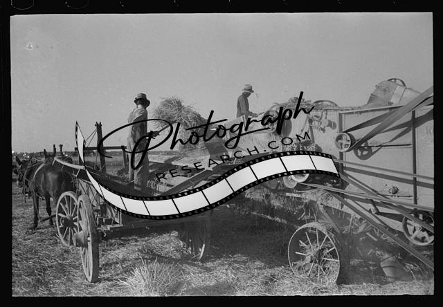 Title: Feeding bundles of rice to thresher on farm near Crowley, Louisiana