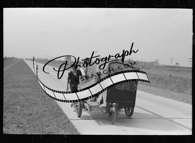 Traveling evangelists pushing cart on road between Lafayette,Scott,Louisiana,1