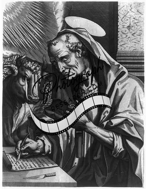 St. Luke,seated outdoors writing,bull lies at his side