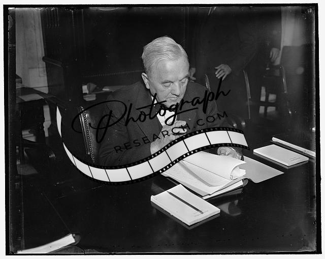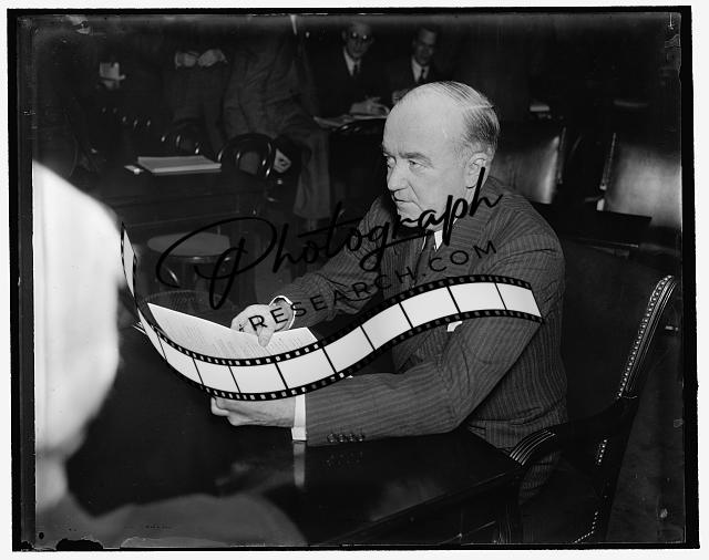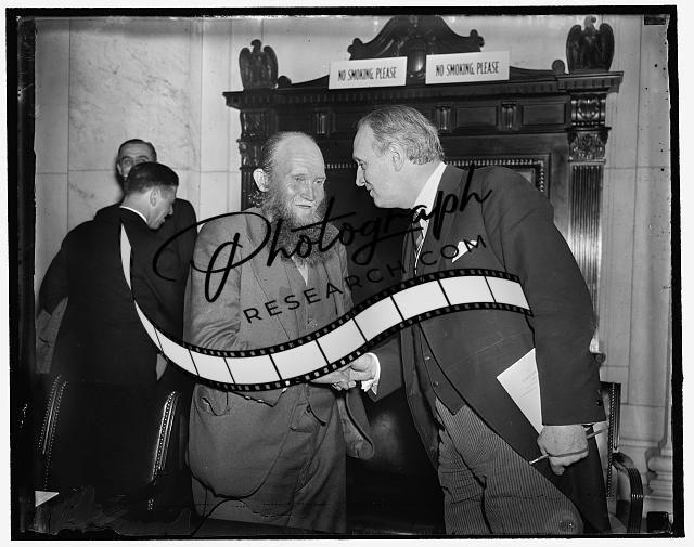 Title: Assistant to Cummings checks up. Washington, D.C., March 12. Joseph D. Keenan, Ass't to the Attorney General is a daily visitor at the Senate Judiciary hearing on the Supreme Court issue. He is shown with the Chairman of the Committee Sen. Henry F. Ashurst, of Arizona [...]