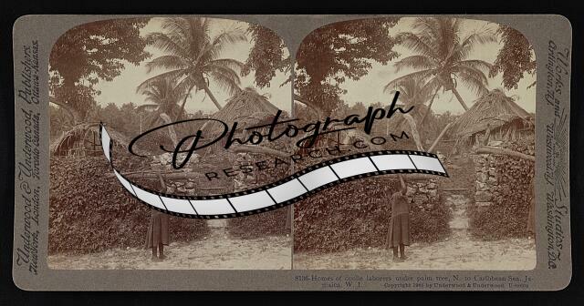 Homes of coolie laborers under palm tree,N. to Caribbean Sea,Jamaica,W.I.