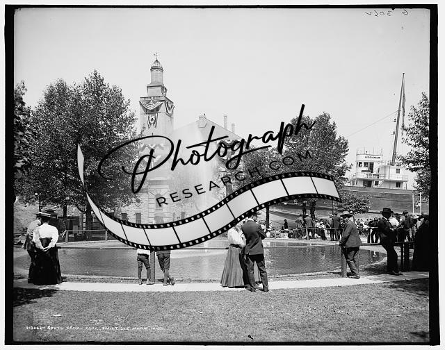 South Canal Park,fountains,buildings,crowd,Sault Stephen Marie,Michigan,MI,c1905