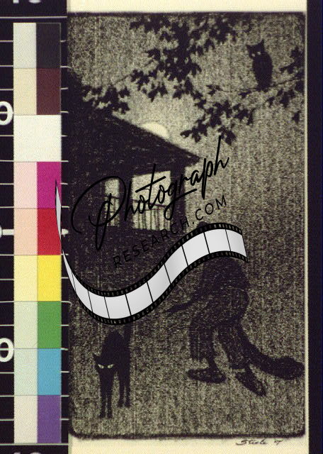 Boy looking in lighted window with Puck,owl,Frederic Dorr Steele,1909?,Night