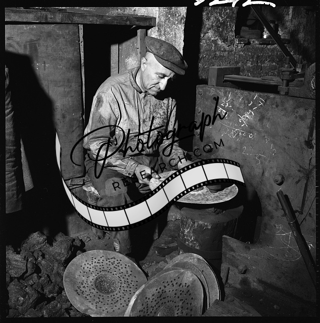 Summary: Photograph shows worker at an oven in the cymbal workshop of Zilciyan (Zildjiyan, Zildjian), outside the walls of Istanbul, Turkey.